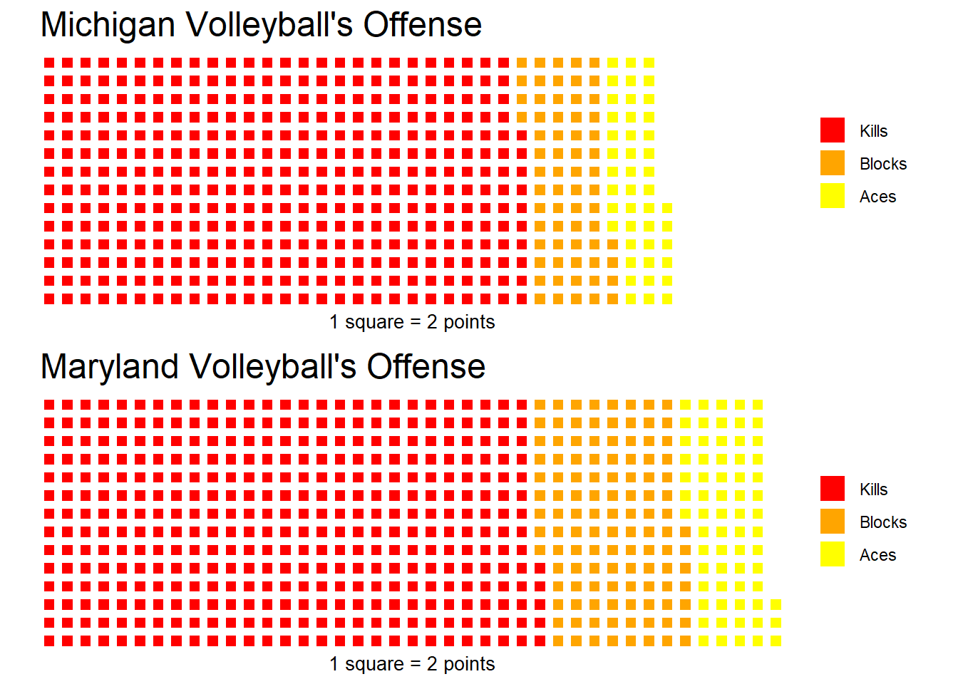Cool! Maryland has scored more points than Michigan. Both teams get about the same amount of points from kills though. Maryland only has 8 more. Maryland gets a lot more blocks and a handful more aces though. This is what really creates the gap between the two teams’ totals.